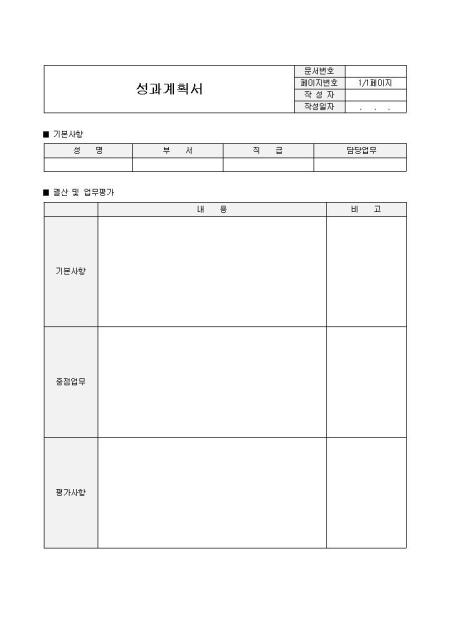성과계획서(일반양식)입니다. 성과계획 및 평가에 대한 서식으로 담당업무, 직급, 부서, 결산 및 업무 평가 등으로 이루어져 있습니다.