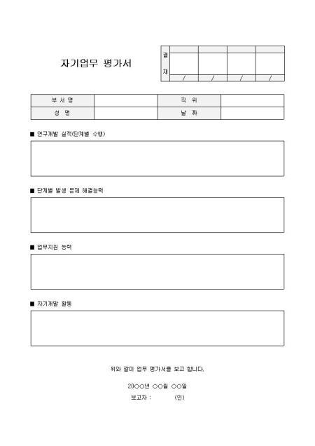 자기업무 평가서(일반양식)입니다. 업무를 진행하면서 자신의 업무능력에 대한 평가를 할 수 있는 서식으로 연구개발실적, 업무지원능력 등으로 구성되어 있습니다.