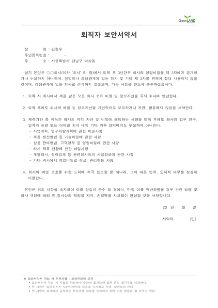 해당 서식은 중소기업의 현장,실무서식을 바탕으로 최적화된 부서별 표준서식입니다. 샘플내용, 작성방법, 관련규정 등 문서 하나에 모든 내용이 포함되어 있어 신입사원부터 사장님까지 누구나 쉽고 편리하게 사용할 수 있습니다. 우리회사만의 로고삽입이 가능하며 통일화된 양식으로 문서체계를 확립할 수 있습니다. 문서의 성격과 용도에 맞게 가장 안정적인 문서레이아웃으로 구성되어 있어 대내외용 문서로 활용도가 높습니다. 퇴직자 보안서약서 (작성방법 포함) ▶ 주요항목 : 서약인, 서약내용(4조항), 서명/날인 등 ▶ 작성방법 및 서식활용TIP : 보안서약서 작성 시 자필로 작성하며 수정이 불가능한 볼펜 등의 필기구를 이용합니다.