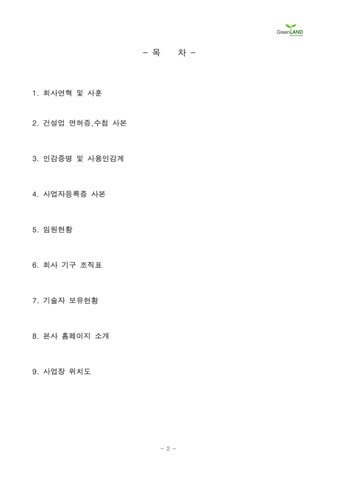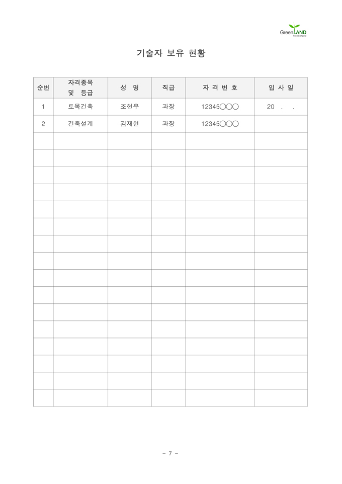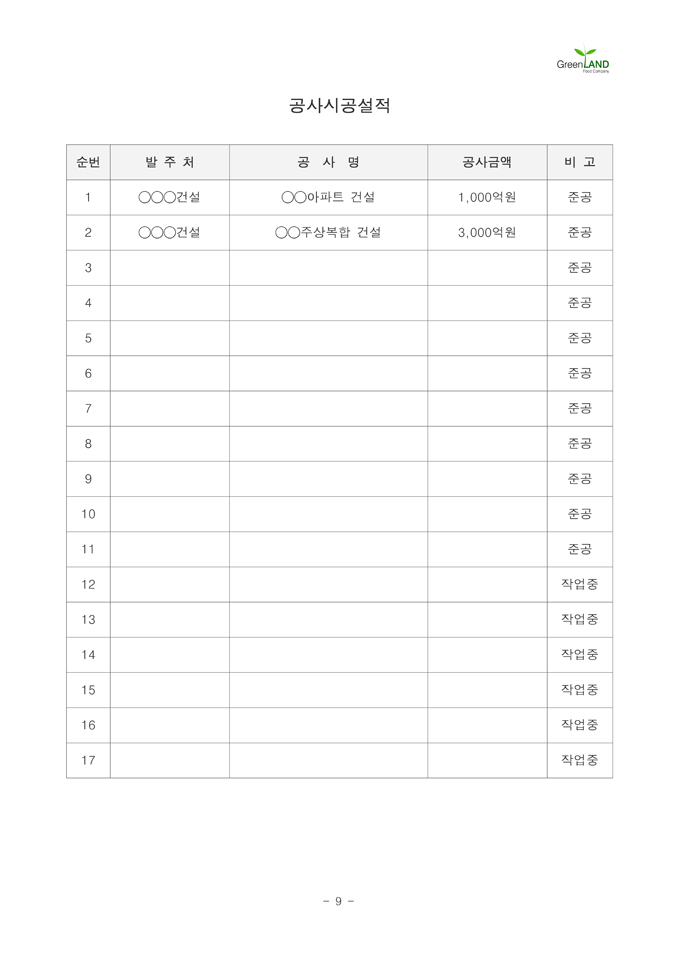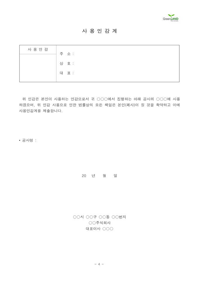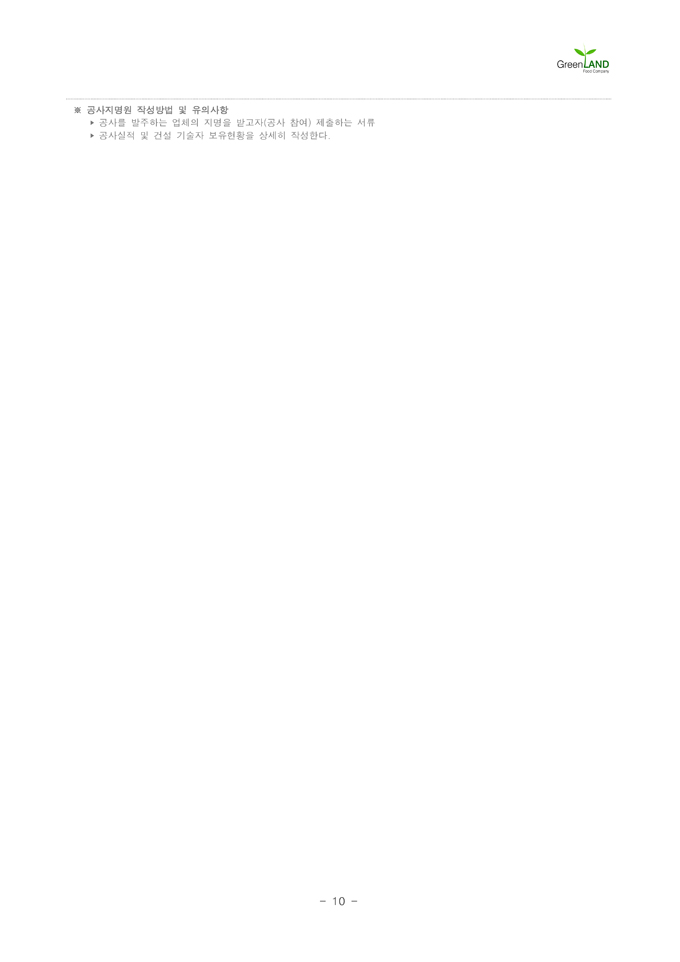 9,000원/월해당 서식은 중소기업의 현장,실무서식을 바탕으로 최적화된 부서별 표준서식입니다. 샘플내용, 작성방법, 관련규정 등 문서 하나에 모든 내용이 포함되어 있어 신입사원부터 사장님까지 누구나 쉽고 편리하게 사용할 수 있습니다. 우리회사만의 로고삽입이 가능하며 통일화된 양식으로 문서체계를 확립할 수 있습니다. 문서의 성격과 용도에 맞게 가장 안정적인 문서레이아웃으로 구성되어 있어 대내외용 문서로 활용도가 높습니다. 표준 공사지명원 (작성방법 포함) ▶ 주요항목 : 회사연혁 및 사훈, 건설업 면허증,수첩 사본, 인감증명 및 사용인감계, 사업자등록증 사본, 임원현황, 회사 기구 조직표, 기술자 보유현황, 본사 홈페이지 소개, 사업장 위치도 등 ▶ 작성방법 및 서식활용TIP : 공사를 발주하는 업체의 지명을 받고자(공사 참여) 제출하는 서류로, 공사실적 및 건설 기술자 보유현황을 상세히 작성하여야 합니다.
