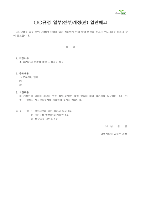 해당 서식은 중소기업의 현장,실무서식을 바탕으로 최적화된 부서별 표준서식입니다. 샘플내용, 작성방법, 관련규정 등 문서 하나에 모든 내용이 포함되어 있어 신입사원부터 사장님까지 누구나 쉽고 편리하게 사용할 수 있습니다. 우리회사만의 로고삽입이 가능하며 통일화된 양식으로 문서체계를 확립할 수 있습니다. 문서의 성격과 용도에 맞게 가장 안정적인 문서레이아웃으로 구성되어 있어 대내외용 문서로 활용도가 높습니다. 표준 사규 개정안 입안예고 (작성방법 포함) ▶ 주요항목 : 개정이유, 주요내용, 의견제출 등 ▶ 작성방법 및 서식활용TIP : 사규개정안 작성 시 사규 일부(전부)개정(안) 입안예고, 사규 일부(전부)개정(안)에 대한 의견서 등의 내용으로 작성?회부하여야 합니다.