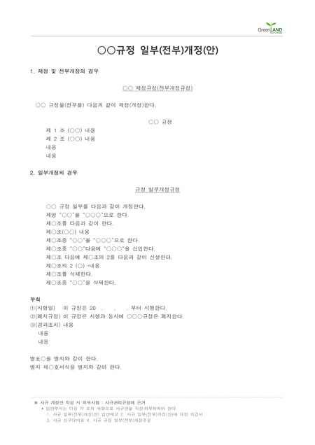 해당 서식은 중소기업의 현장,실무서식을 바탕으로 최적화된 부서별 표준서식입니다. 샘플내용, 작성방법, 관련규정 등 문서 하나에 모든 내용이 포함되어 있어 신입사원부터 사장님까지 누구나 쉽고 편리하게 사용할 수 있습니다. 우리회사만의 로고삽입이 가능하며 통일화된 양식으로 문서체계를 확립할 수 있습니다. 문서의 성격과 용도에 맞게 가장 안정적인 문서레이아웃으로 구성되어 있어 대내외용 문서로 활용도가 높습니다. 표준 사규 개정안 (작성방법 포함) ▶ 주요항목 : 제정 및 전부개정의 경우, 일부개정의 경우, 부칙 등 ▶ 작성방법 및 서식활용TIP : 사규개정안 작성 시 사규 일부(전부)개정(안) 입안예고, 사규 일부(전부)개정(안)에 대한 의견서 등의 내용으로 작성?회부하여야 합니다.