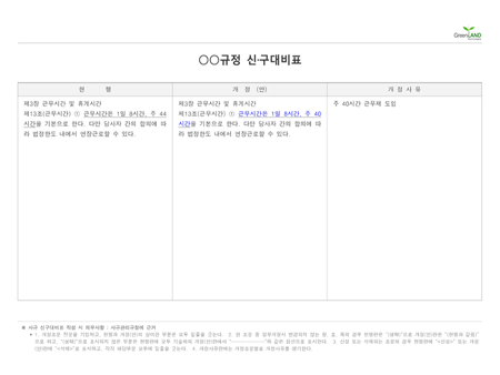 해당 서식은 중소기업의 현장,실무서식을 바탕으로 최적화된 부서별 표준서식입니다. 샘플내용, 작성방법, 관련규정 등 문서 하나에 모든 내용이 포함되어 있어 신입사원부터 사장님까지 누구나 쉽고 편리하게 사용할 수 있습니다. 우리회사만의 로고삽입이 가능하며 통일화된 양식으로 문서체계를 확립할 수 있습니다. 문서의 성격과 용도에 맞게 가장 안정적인 문서레이아웃으로 구성되어 있어 대내외용 문서로 활용도가 높습니다. 표준 사규 신구대비표 (작성방법 포함) ▶ 주요항목 : 현행, 개정, 개정사유 등 ▶ 작성방법 및 서식활용TIP : 사규 신구대비표 작성 시 개정조문 전문을 기입하고, 현행과 개정(안)의 상이한 부분은 모두 밑줄을 긋습니다.