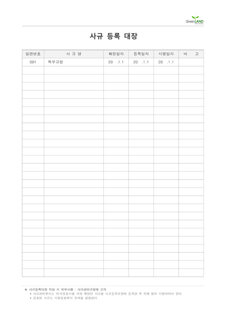 해당 서식은 중소기업의 현장,실무서식을 바탕으로 최적화된 부서별 표준서식입니다. 샘플내용, 작성방법, 관련규정 등 문서 하나에 모든 내용이 포함되어 있어 신입사원부터 사장님까지 누구나 쉽고 편리하게 사용할 수 있습니다. 우리회사만의 로고삽입이 가능하며 통일화된 양식으로 문서체계를 확립할 수 있습니다. 문서의 성격과 용도에 맞게 가장 안정적인 문서레이아웃으로 구성되어 있어 대내외용 문서로 활용도가 높습니다. 표준 사규등록대장 (작성방법 포함) ▶ 주요항목 : 일련번호, 사규명, 확정일자, 등록일자, 시행일자, 비고 등 ▶ 작성방법 및 서식활용TIP : 사규관리부서는 제?개정절차를 거쳐 확정된 사규를 사규등록대장에 등록한 후 지체 없이 시행하여야 합니다.
