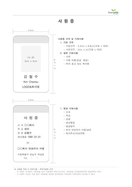 해당 서식은 중소기업의 현장,실무서식을 바탕으로 최적화된 부서별 표준서식입니다. 샘플내용, 작성방법, 관련규정 등 문서 하나에 모든 내용이 포함되어 있어 신입사원부터 사장님까지 누구나 쉽고 편리하게 사용할 수 있습니다. 우리회사만의 로고삽입이 가능하며 통일화된 양식으로 문서체계를 확립할 수 있습니다. 문서의 성격과 용도에 맞게 가장 안정적인 문서레이아웃으로 구성되어 있어 대내외용 문서로 활용도가 높습니다. 표준 사원증 (작성방법 포함) ▶ 주요항목 : 사원증 규격 및 기재사항(앞면, 뒷면) 등 ▶ 작성방법 및 서식활용TIP : 사원은 사내에서 사원증을 상시 착용해야 하며 퇴사자는 사원증을 인사담당부서에 반납하여야 합니다.