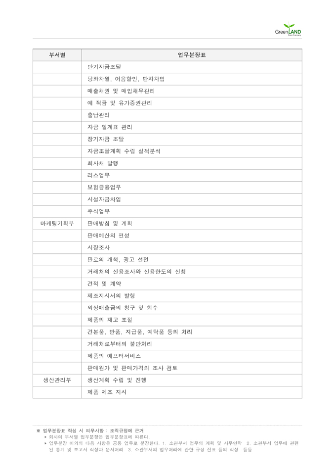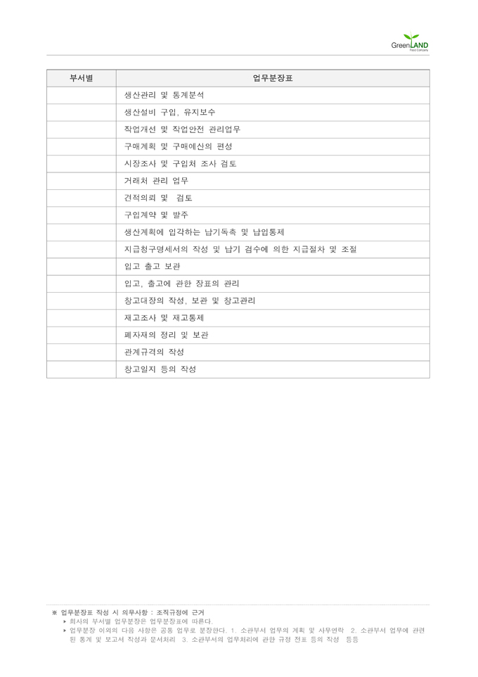 9,000원/월해당 서식은 중소기업의 현장,실무서식을 바탕으로 최적화된 부서별 표준서식입니다. 샘플내용, 작성방법, 관련규정 등 문서 하나에 모든 내용이 포함되어 있어 신입사원부터 사장님까지 누구나 쉽고 편리하게 사용할 수 있습니다. 우리회사만의 로고삽입이 가능하며 통일화된 양식으로 문서체계를 확립할 수 있습니다. 문서의 성격과 용도에 맞게 가장 안정적인 문서레이아웃으로 구성되어 있어 대내외용 문서로 활용도가 높습니다. 표준 업무분장표 (작성방법 포함) ▶ 주요항목 : 경영지원부, 마케팅기획부, 생산관리부 등 ▶ 작성방법 및 서식활용TIP : 부서별 업무분장을 구분하고 업무분장 이외의 소관부서 업무의 계획 및 사무연락, 소관부서 업무에 관련된 통계 및 보고서 작성과 문서처리, 소관부서의 업무처리에 관한 규정 전표 등의 작성 등은 공통업무로 합니다.