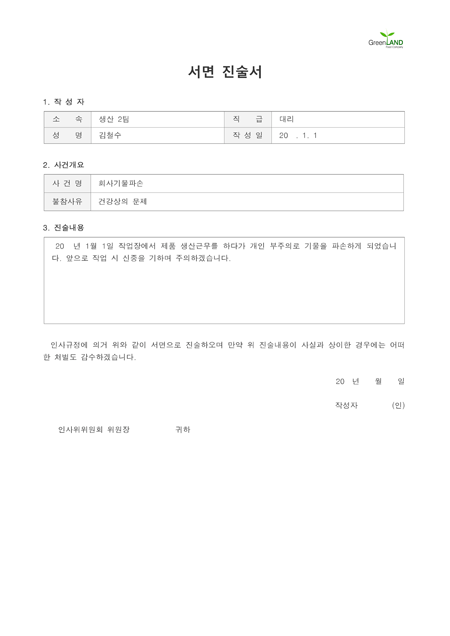 해당 서식은 중소기업의 현장,실무서식을 바탕으로 최적화된 부서별 표준서식입니다. 샘플내용, 작성방법, 관련규정 등 문서 하나에 모든 내용이 포함되어 있어 신입사원부터 사장님까지 누구나 쉽고 편리하게 사용할 수 있습니다. 우리회사만의 로고삽입이 가능하며 통일화된 양식으로 문서체계를 확립할 수 있습니다. 문서의 성격과 용도에 맞게 가장 안정적인 문서레이아웃으로 구성되어 있어 대내외용 문서로 활용도가 높습니다. 표준 인사위원회 서면진술서 (작성방법 포함) ▶ 주요항목 : 작성자, 사건개요(사건명, 불참사유), 진술내용 등 ▶ 작성방법 및 서식활용TIP : 인사위원회는 징계대상자가 출석을 원하지 아니할 때에는 서면진술서를 제출하게 하여 기록에 첨부하고 서면심사만으로 징계의결을 할 수 있습니다.
