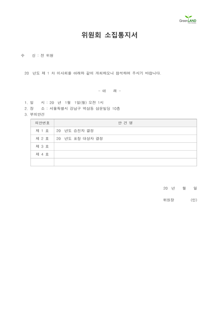 해당 서식은 중소기업의 현장,실무서식을 바탕으로 최적화된 부서별 표준서식입니다. 샘플내용, 작성방법, 관련규정 등 문서 하나에 모든 내용이 포함되어 있어 신입사원부터 사장님까지 누구나 쉽고 편리하게 사용할 수 있습니다. 우리회사만의 로고삽입이 가능하며 통일화된 양식으로 문서체계를 확립할 수 있습니다. 문서의 성격과 용도에 맞게 가장 안정적인 문서레이아웃으로 구성되어 있어 대내외용 문서로 활용도가 높습니다. 표준 인사위원회 소집통지서 (작성방법 포함) ▶ 주요항목 : 수신, 일시, 장소, 부의안건 등 ▶ 작성방법 및 서식활용TIP : 인사위원회를 소집할 사유가 발생한 때에는 위원장은 간사로 하여금 위원회의 개최의 목적과 안건을 명시한 위원회소집통지서를 사전에 각 위원에게 발송하여야 합니다.