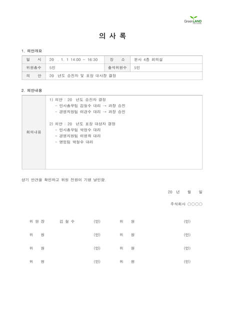 해당 서식은 중소기업의 현장,실무서식을 바탕으로 최적화된 부서별 표준서식입니다. 샘플내용, 작성방법, 관련규정 등 문서 하나에 모든 내용이 포함되어 있어 신입사원부터 사장님까지 누구나 쉽고 편리하게 사용할 수 있습니다. 우리회사만의 로고삽입이 가능하며 통일화된 양식으로 문서체계를 확립할 수 있습니다. 문서의 성격과 용도에 맞게 가장 안정적인 문서레이아웃으로 구성되어 있어 대내외용 문서로 활용도가 높습니다. 표준 인사위원회 의사록 (작성방법 포함) ▶ 주요항목 : 의안개요, 의안내용 등 ▶ 작성방법 및 서식활용TIP : 인사위원회의 간사는 회의의 의사를 기록하여 참석위원의 날인을 받아 의사록으로 보관하여야 합니다.