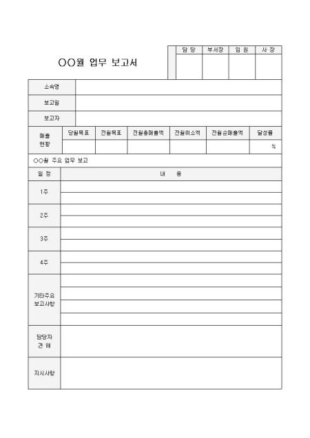 월업무보고서(기본양식)입니다. 월별 업무에 관하여 보고서 작성 시 사용하는 문서로 소속명, 보고일, 보고자, 매출현황, 주업무보고 내용, 담당자견해 등의 항목으로 구성되어 있습니다.