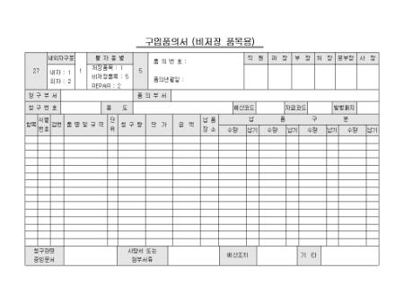 비저장품목에 대한 구입품의서 양식입니다. 품명 및 규격, 단위, 청구량, 단가, 금액, 납품구분등을 기재하도록 되어 있습니다.