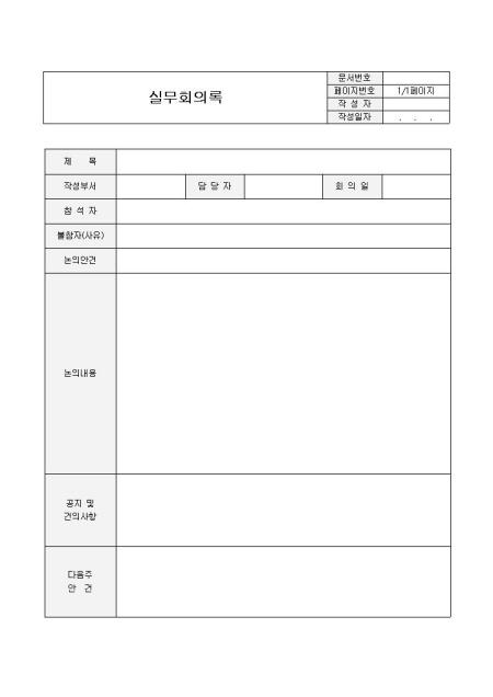 실무회의록(간단양식)입니다. 제목, 작성부서, 담당자, 참석자, 불참자(사유), 논의안건, 논의내용 등의 항목으로 구성되어 있습니다. 실무회의후 회의내용 및 공지사항 작성시 사용할 수 있습니다.