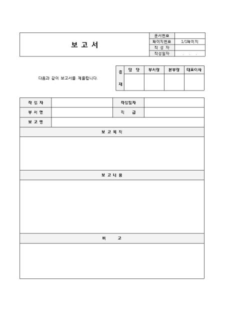 보고서(간단양식)입니다. 기본적인 보고서의 형태로 보고목적, 보고내용, 비고 등으로 구성되어 있습니다.