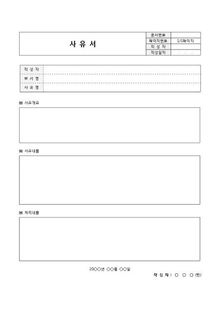 기본사유서입니다. 기본에 충실하여 제작된 서식으로 작성자, 부서명, 사유명, 사유개요, 내용, 처리내용 등으로 구성되어 있습니다.