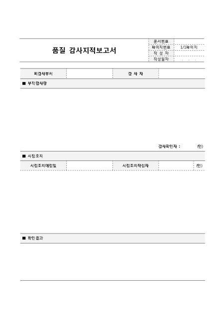 품질 감사지적보고서입니다. 품질감사 지적에 대한 보고서로 피감사부서, 감사자, 부적합사항, 시정조치, 확인결과 등으로 구성되어 있습니다.