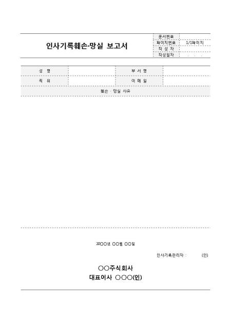 인사기록훼손망실 보고서입니다. 인사기록훼손망실에 대한 사유서를 작성할 때 사용하는 보고서입니다.