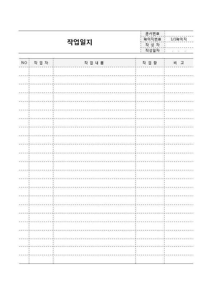 9,000원/월작업일지입니다. 작업내용에 대하여 간단히 작성하는 문서로 작업자, 작업내용, 작업량 등으로 구성되어 있습니다.