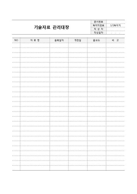 기술자료 관리대장입니다. 기술자료를 관리하기 위해 작성하는 표로 자료명, 등록일자, 개정일, 중요도 등으로 구성되어 있습니다.