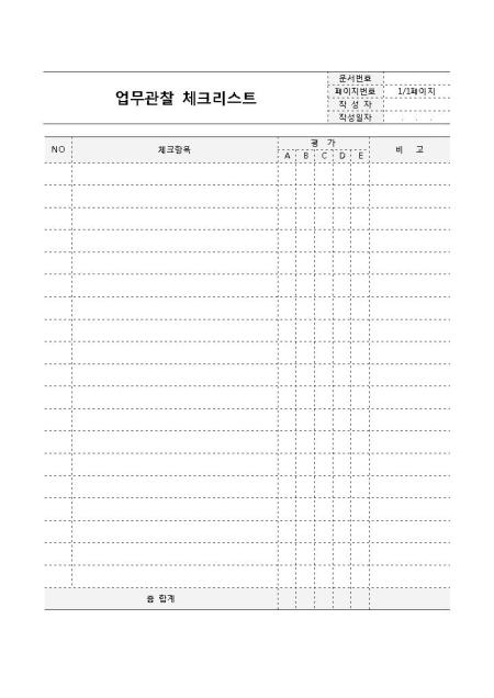 업무관찰 체크리스트입니다. 체크항목, 평가등급, 비고 등으로 구성되어 있습니다.