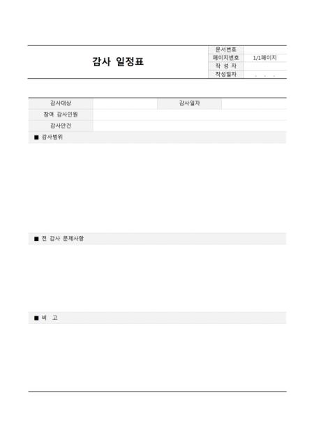 감사 일정표(기본양식)입니다. 감사대상, 감사일자, 참여 감사인원, 감사안건, 감사범위, 전 감사 문제사항, 비고 등으로 구성되어 있습니다.