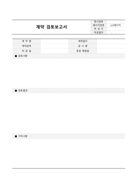 계약 검토보고서입니다. 계약명, 계약일자, 계약금액, 공사명, 착공일, 준공예정일, 검토사항, 결과 등으로 구성되어 있습니다.