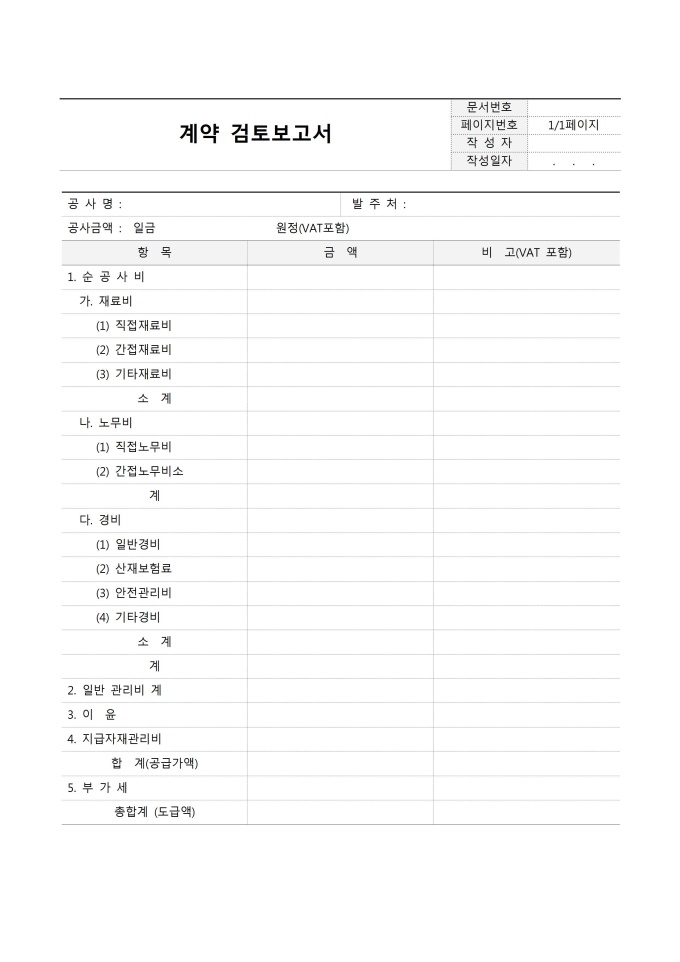 9,000원/월공사원가계산서(일반)입니다. 공사명, 발주처, 공사금액, 항목, 금액, 비고 등의 항목으로 구성되어 있습니다.