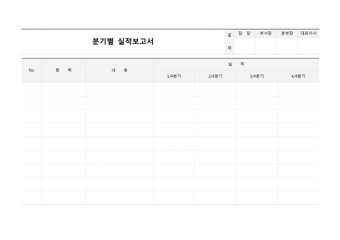 9,000원/월분기별실적보고서 입니다. No, 항목, 내용, 실적(1/4분기, 2/4분기, 3/4분기, 4/4분기) 등의 항목으로 구성되어 있습니다.