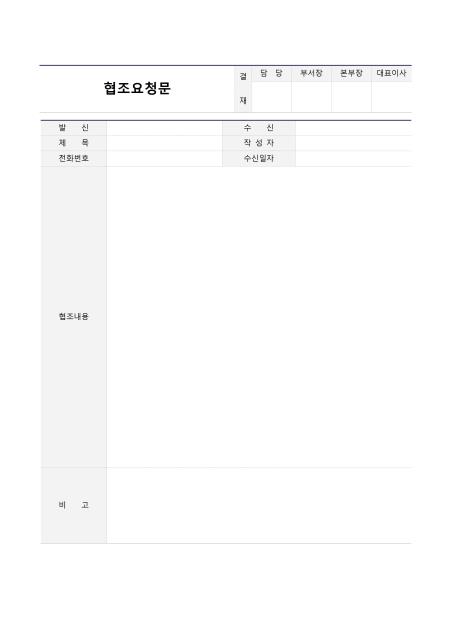 협조요청문입니다. 발신, 수신, 제목, 작성자, 전화번호, 수신일자, 협조내용 등의 항목으로 구성되어 있습니다.