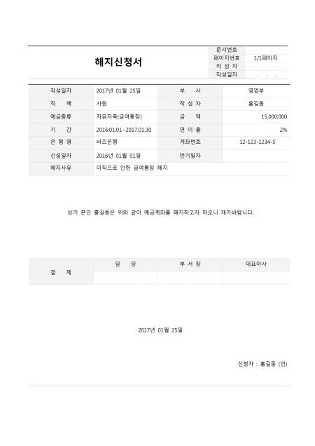 해지신청서입니다. 작성일자, 부서, 직책, 작성자, 예금종류, 금액, 기간, 연이율, 은행명, 계좌번호, 신설일자, 만기일자, 해지사유, 결제, 담당, 부서장, 대표이사 등의 항목으로 구성되어있습니다.