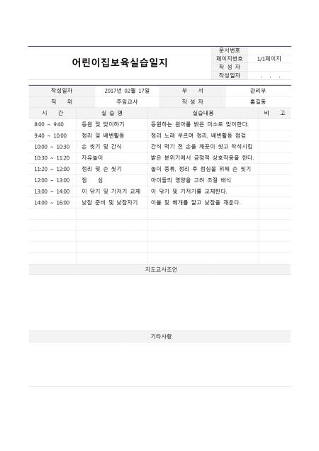 어린이집보육실습일지입니다. 작성일자, 부서, 직위, 작성자, 지도교사조언, 기타사항 등의 항목으로 구성되어있습니다.