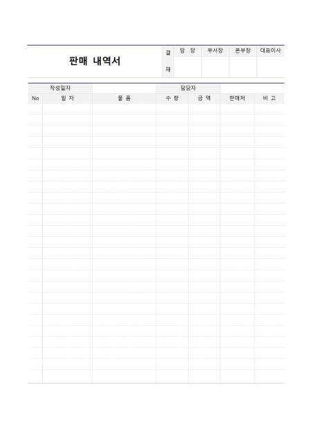 판매내역서 입니다. 작성일자, 담당자, No, 일자, 물품, 수량, 금액, 판매처, 비고 등의 항목으로 구성되어 있습니다.