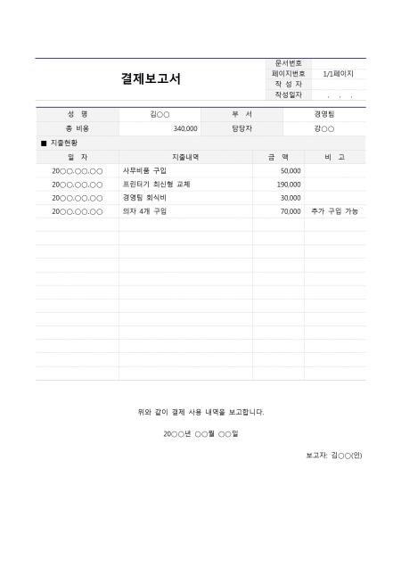 결제보고서입니다. 성명, 부서, 총 비용, 담당자, 지출현황, 일자, 지출내역, 금액, 비고 등의 항목으로 구성되어 있습니다.