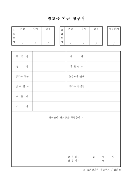 경조금 지급을 청구할때 사용하는 양식으로 부서명,직위,성명,사원번호,경조사 구분,입사일자,지급액을 기록하는 양식입니다.
