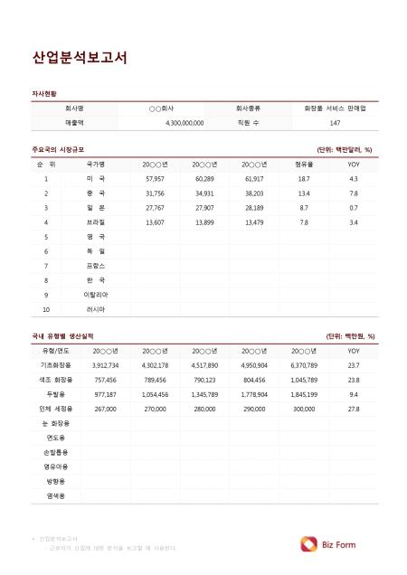 산업분석보고서입니다. 회사명, 회사종류, 매출액, 직원 수, 주요국의 시장규모 순위, 국가명, 연도, 점유율, YOY, 국내 유형별 생산실적 유형, 연도, YOY 등의 항목으로 구성되어 있습니다.