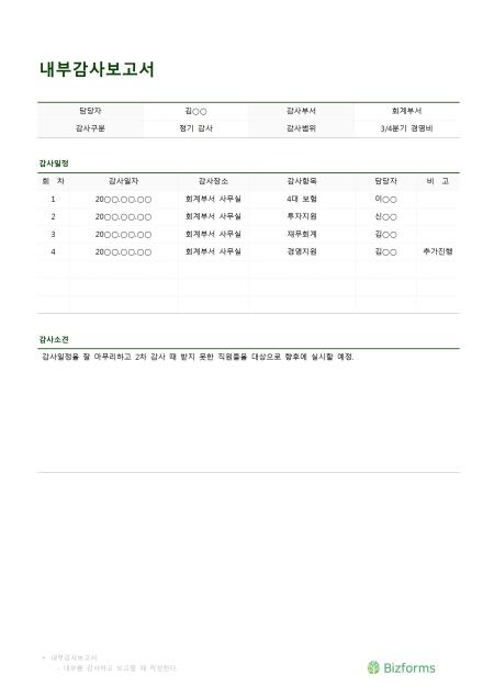 내부감사보고서입니다. 담당자, 감사부서, 감사구분, 감사범위, 감사일정 회차, 감사일자, 감사장소, 감사항목, 담당자, 비고, 감사소견 등의 항목으로 구성되어 있습니다.