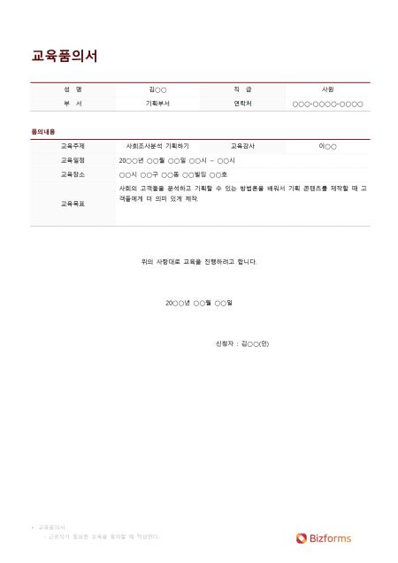 교육품의서입니다. 성명, 직급, 부서, 연락처, 품의내용 교육주제, 교육강사, 교육일정, 교육장소, 교육목표 등의 항목으로 구성되어 있습니다.