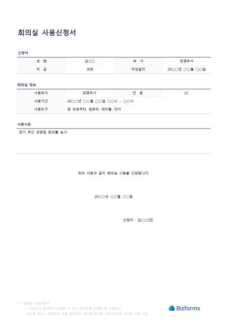 회의실사용신청서입니다. 성명, 부서, 직급, 작성일자, 사용부서, 인원, 사용기간, 사용도구, 사용사유 등의 항목으로 구성되어 있습니다.