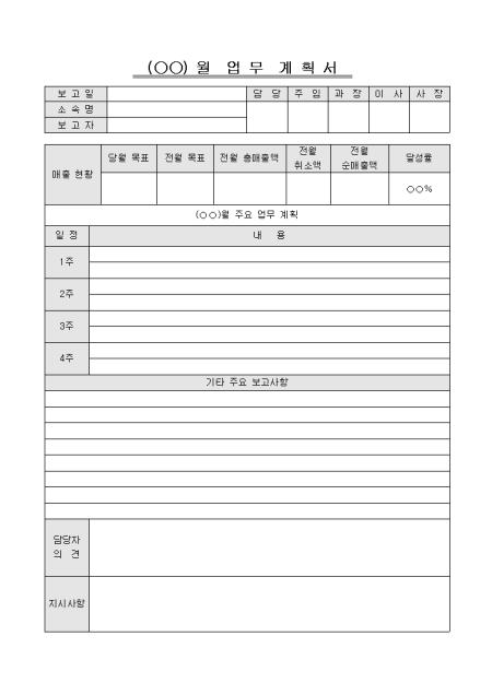 월내 업무에 대한 목표,매출등의 내용을 기입하고 각주간의 업무일정을 보고할 때 사용하는 계획서 양식입니다.