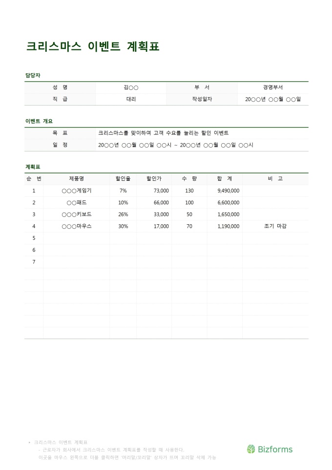9,000원/월크리스마스이벤트계획표입니다. 성명, 부서, 직급, 작성일자, 목표, 일정, 순번, 제품명, 할인율, 할인가, 수량, 합계, 비고 등의 항목으로 구성되어 있습니다.