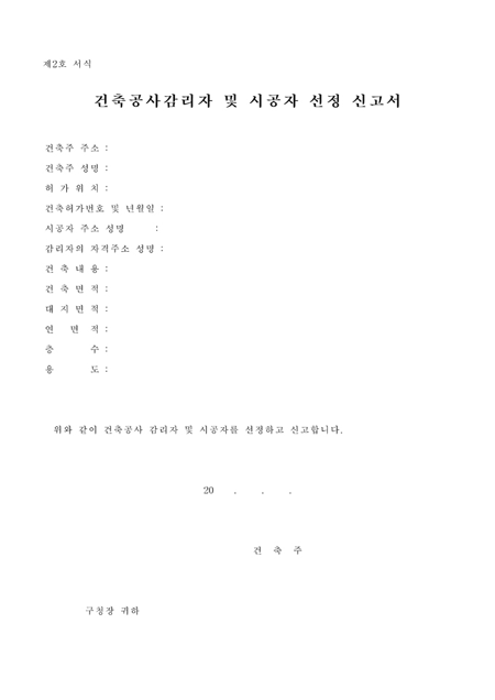 건축주,시공자,감리자의 인적사항과 건축내용,건축면적,대지면적,연면적,층수,용도를 기재하는 건축공사감리자 및 시공자 선정 신고서입니다.