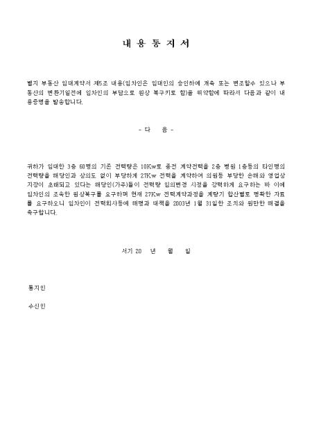 당사간의 약속에 대한 내용확인을 위해 발송하는 내용통지서(내용증명)양식입니다.