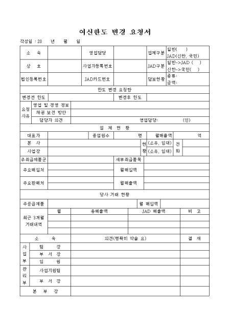 여신한도에 대해 변경을 요청할 때 사용하는 양식으로 개인인적사항과 한도변경요청란, 업체현황, 당사거래 현황등의 내용으로 구성되어 있는 양식입니다.