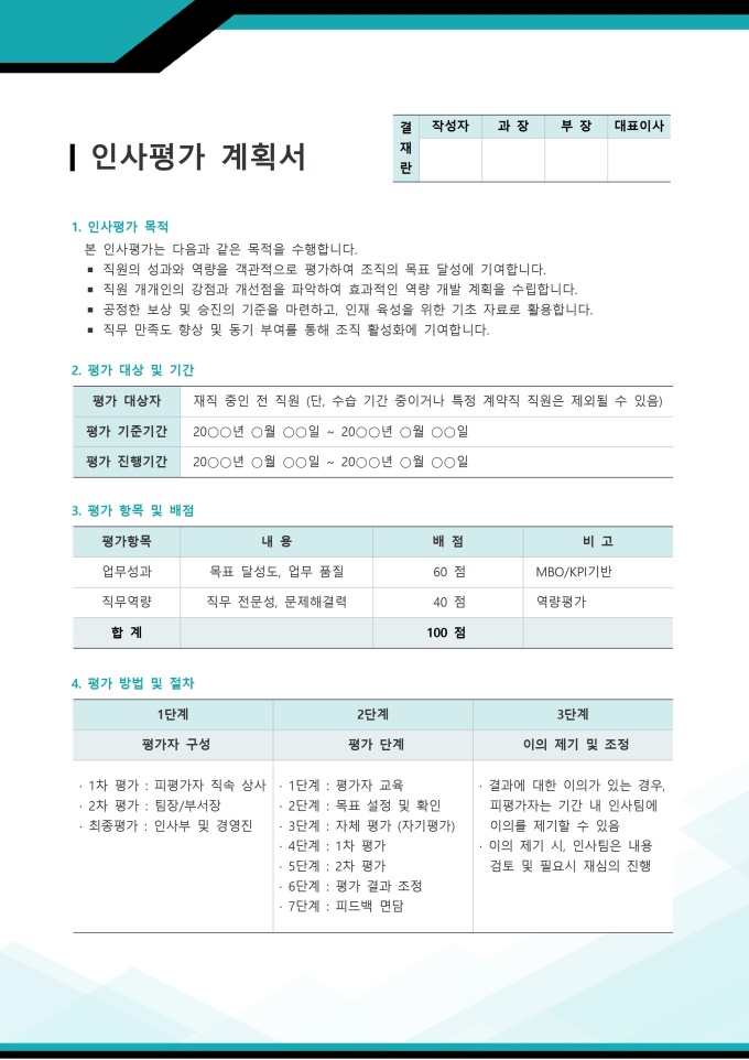인사평가 계획서 서식입니다. 인사평가 계획서는 조직 내 모든 직원에 대한 성과와 역량을 체계적으로 평가하기 위한 전체적인 로드맵이자 지침서로써, 인사평가가 공정하고 객관적으로 이루어지도록 평가의 목적, 대상, 기간, 평가 항목 및 기준, 평가 방법, 평가 결과의 활용 방안까지 상세하게 명시하는 문서입니다.