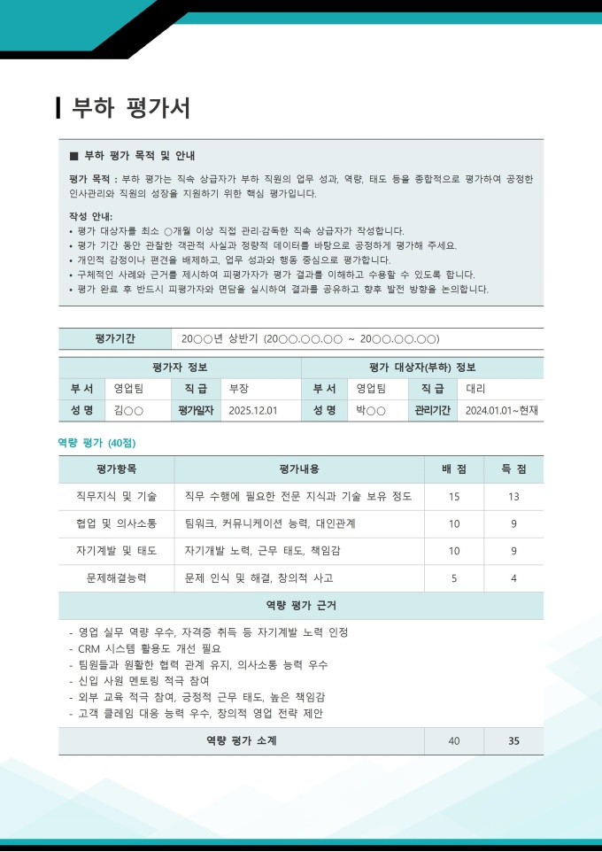 부하 평가서 서식입니다. 인사평가 시 작성하는 부하 평가서는 직속 상급자가 자신의 부하직원의 일정 기간 동안의 업무 성과, 직무 역량 등을 종합적으로 판단하고 기록하는 공식 문서입니다. 이 평가서는 인사평가 과정에서 가장 핵심적인 부분 중 하나로, 부하직원의 강점과 개선 필요 영역을 명확히 제시하며, 향후 성장을 위한 구체적인 피드백과 발전 방향을 제시하는 데 중요한 역할을 합니다.