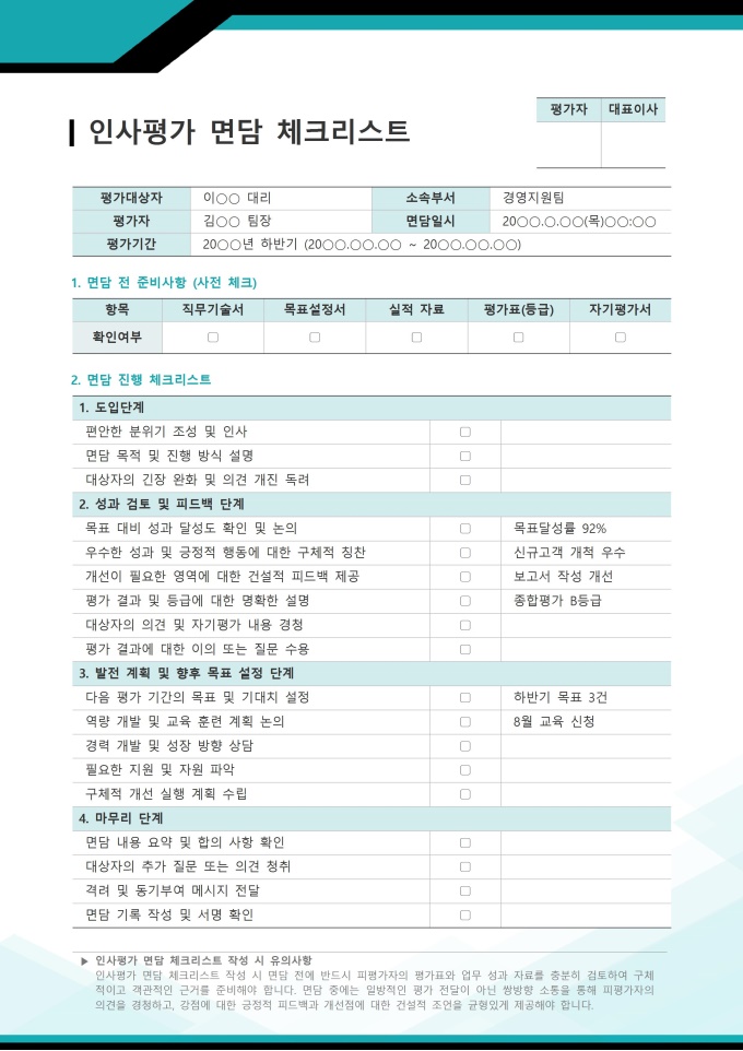 인사평가 면담 체크리스트 서식입니다. 인사평가 면담 체크리스트는 관리자가 직원들과의 성과 면담을 체계적이고 효과적으로 진행할 수 있도록 돕는 실용적인 가이드라인입니다. 이는 단순히 평가 결과를 전달하는 것을 넘어, 직원의 성장과 발전을 지원하는 건설적인 대화의 장을 마련하기 위한 면담 전반의 단계를 점검하고 준비하는 데 활용됩니다. 본 체크리스트를 활용함으로써 평가의 일관성을 유지하고, 발생 가능한 중요한 논의 누락을 방지할 수 있습니다.