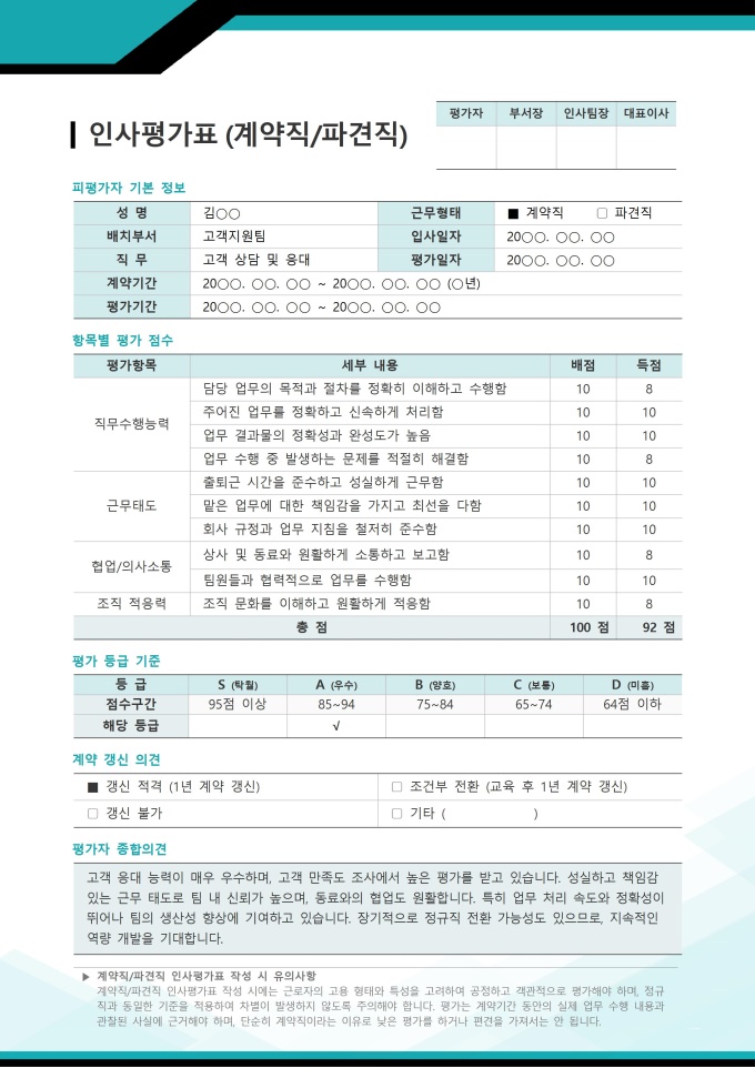 계약직/파견직 인사평가표 서식입니다. 계약직/파견직 인사평가표는 기간제 근로자나 파견 직원의 업무 수행 능력과 근무 태도를 평가하여 계약 갱신 여부를 결정하기 위한 문서로 정규직 평가표와 달리 계약직 근로자에게 요구되는 기본적인 역량을 중심으로 구성되어 있습니다. 평가 결과는 계약 갱신 의사결정에 활용되며, 계약직 근로자의 권익 보호와 공정한 처우를 위한 객관적인 근거 자료가 됩니다.