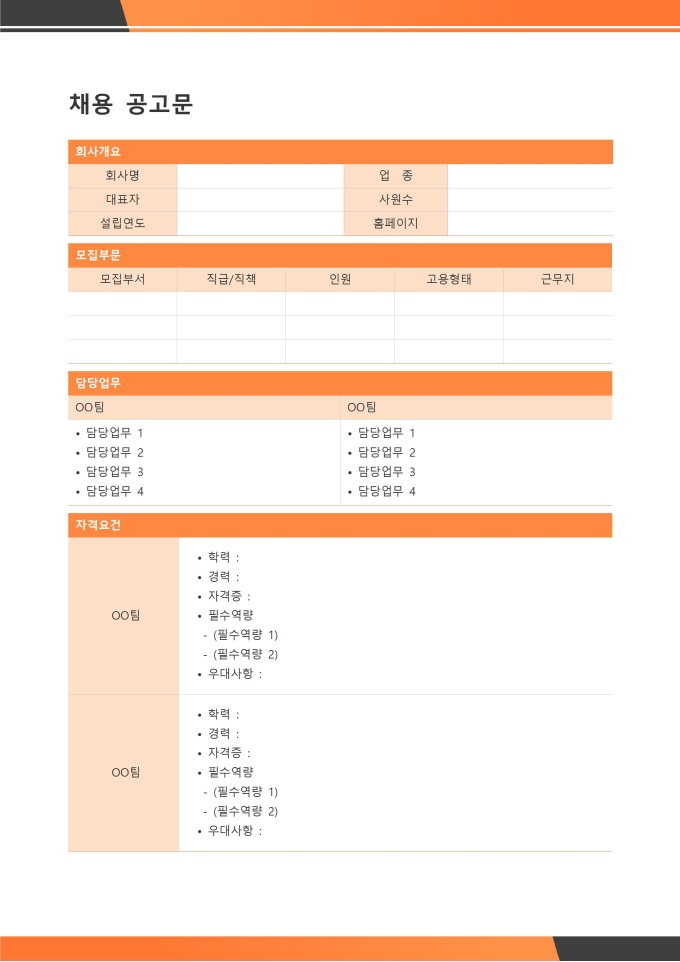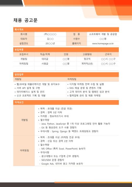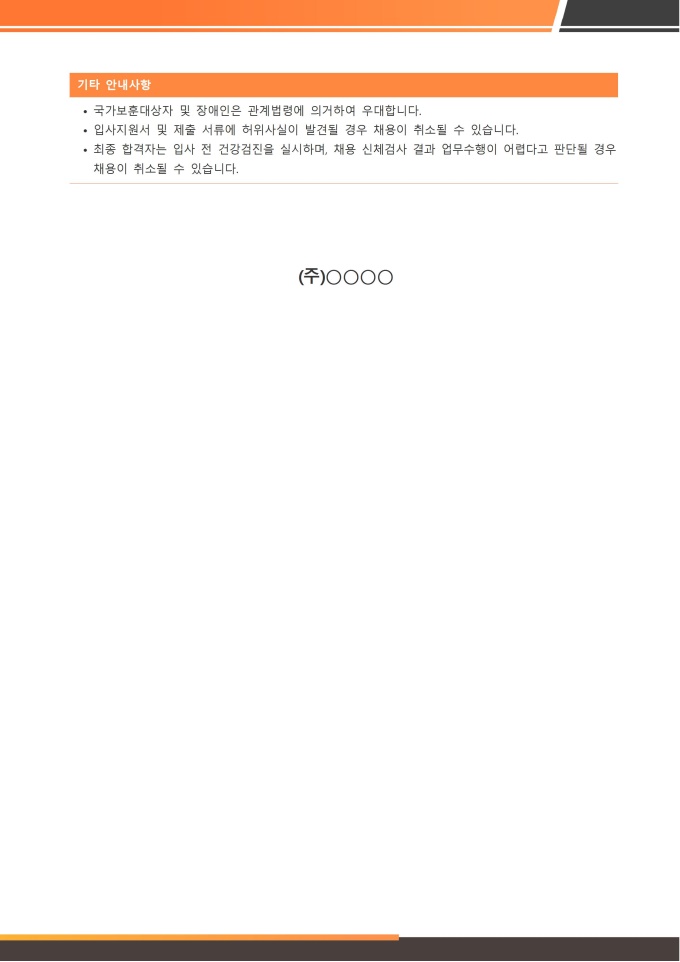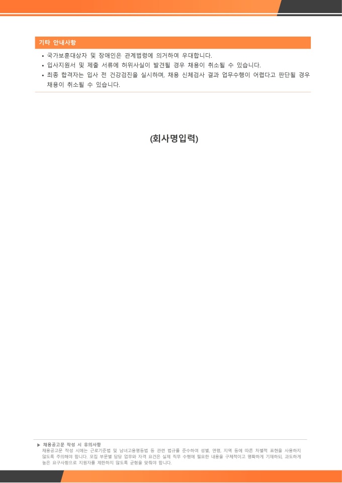 채용 공고문 서식입니다. 채용 공고문은 특정 직무 또는 포지션에 적합한 인재를 모집하기 위해 공개적으로 발표하는 문서로 이는 구직자들에게 기업과 직무에 대한 첫인상을 주고 지원 여부를 결정하는 중요한 정보원이 됩니다. ★[채용 서식 패키지]는 인재 채용의 전 과정을 체계적으로 관리할 수 있도록 채용공고, 입사지원서, 면접평가표, 신원보증서, 입사서류 체크리스트 등 채용 업무에 필요한 핵심 서식들을 한데 모아 제공합니다. 이 패키지를 활용하면 채용 담당자는 공정하고 효율적인 전형 프로세스를 운영할 수 있습니다.