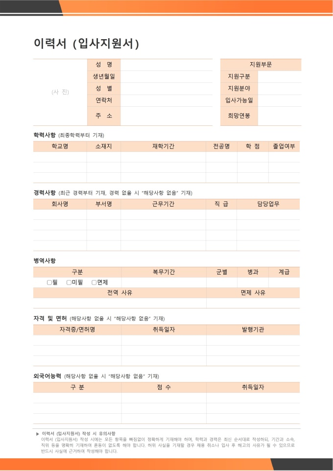 이력서 (입사지원서) 서식입니다. 이력서 또는 입사지원서는 개인이 특정 직무나 기업에 지원할 때, 자신의 학력, 경력, 자격, 능력 등 인적 사항을 종합적으로 정리하여 제시하는 문서입니다. ★[채용 서식 패키지]는 인재 채용의 전 과정을 체계적으로 관리할 수 있도록 채용공고, 입사지원서, 면접평가표, 신원보증서, 입사서류 체크리스트 등 채용 업무에 필요한 핵심 서식들을 한데 모아 제공합니다. 이 패키지를 활용하면 채용 담당자는 공정하고 효율적인 전형 프로세스를 운영할 수 있습니다.