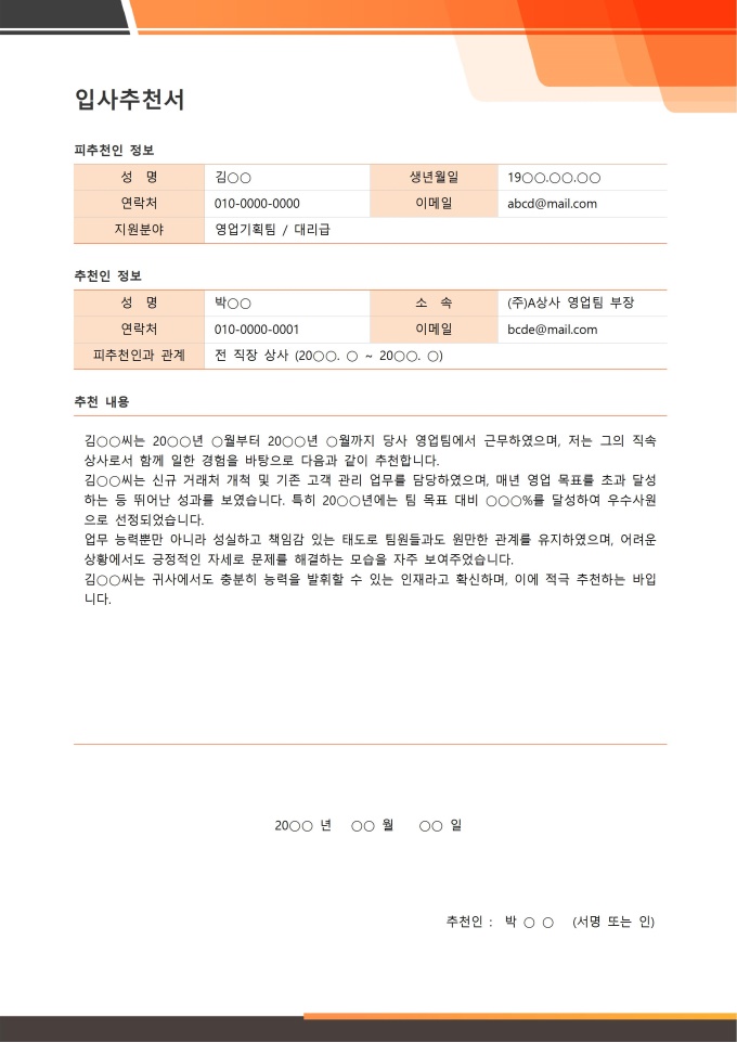 입사추천서 서식입니다. 입사추천서는 특정 회사나 기관에 입사를 지원하는 사람(지원자)의 역량, 자질, 인성 등을 잘 아는 제3자(추천인)가 작성하여, 해당 지원자를 채용하는 데 도움을 주기 위해 제출하는 공식 문서입니다. ★[채용 서식 패키지]는 인재 채용의 전 과정을 체계적으로 관리할 수 있도록 채용공고, 입사지원서, 면접평가표, 신원보증서, 입사서류 체크리스트 등 채용 업무에 필요한 핵심 서식들을 한데 모아 제공합니다. 이 패키지를 활용하면 채용 담당자는 공정하고 효율적인 전형 프로세스를 운영할 수 있습니다.