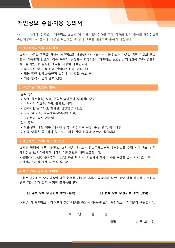 개인정보 수집·이용 동의서 서식입니다. 구직자가 기업에 입사 지원을 할 때, 해당 기업이 지원자의 개인 정보를 수집하고 활용하는 것에 대해 동의를 받는 공식적인 문서입니다. ★[채용 서식 패키지]는 인재 채용의 전 과정을 체계적으로 관리할 수 있도록 채용공고, 입사지원서, 면접평가표, 신원보증서, 입사서류 체크리스트 등 채용 업무에 필요한 핵심 서식들을 한데 모아 제공합니다. 이 패키지를 활용하면 채용 담당자는 공정하고 효율적인 전형 프로세스를 운영할 수 있습니다.